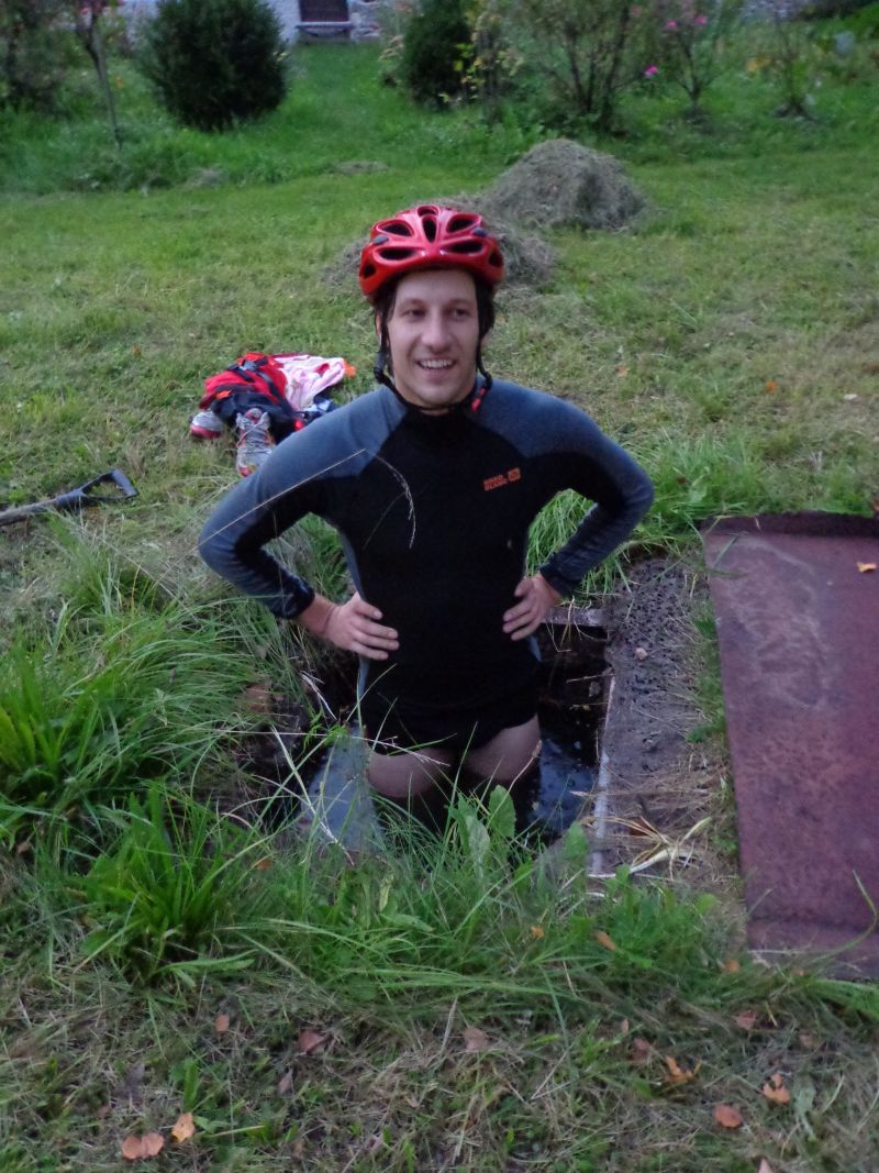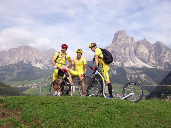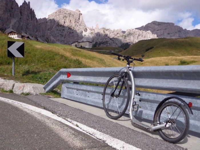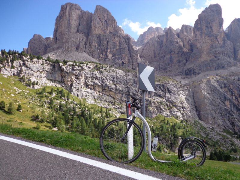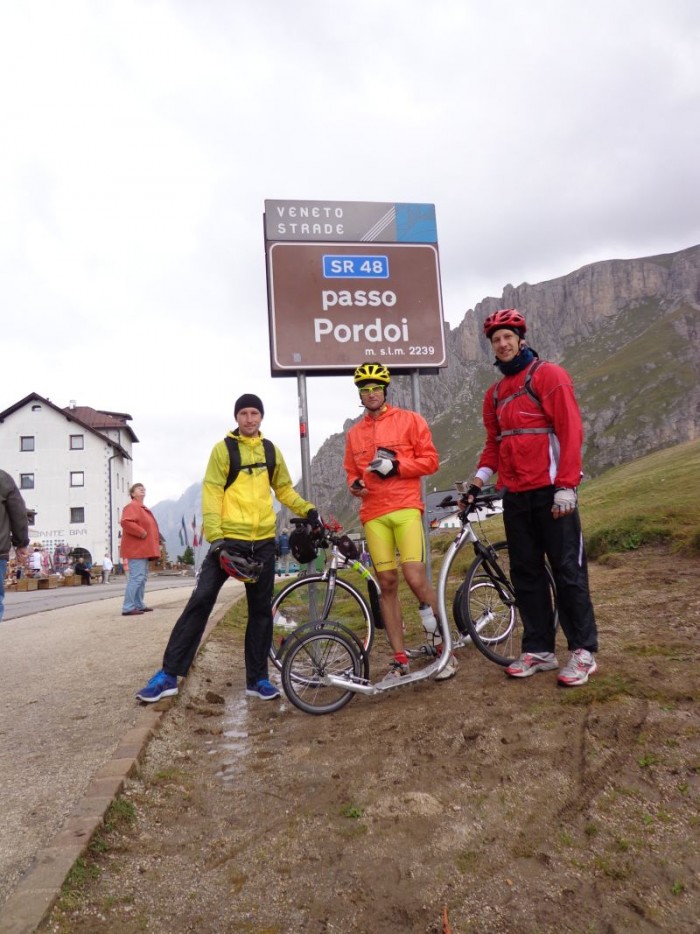 Budíček 4.45. Svižná snídaně, sedáme do vozu a vydáváme se na start – vesnička Pfalzen. 7.00 výjezd. Je kolem 5°C. Prvních 10km roztáčíme pomalu náš vláček do mírného stoupání – ideální na ranní zahřátí! Poté překrásný sjezd. Následuje 15ti kilometrový rovinatý úsek po hlavní silnici – asi nejnepříjemnější část celé cesty, a dále se začíná stoupat pomalu ale jistě na Passo Valparola ( cca 40km do kopce ), na jehož vrcholu vzdává pan Liška pro bolest achillovky a aby nezdržoval soukeníky pana Jana a Jaromíra vzdává se možnosti překrásného 50km dlouhého sjezdu do Caprile, kde pan Jaromír získal rychlostní prémii, dále na Alleghe a Agordo. Poté přichází stoupání s názvem Passo Duran – stoupání první kategorie v pekelném vedru. Zde je jednodušší a méně namáhavé jíti pěšmo, než se odrážet. Následný sjezd klikatou a neskutečně úzkou silnicí, kde se nevejdou dvě auta vedle sebe, v nás vzbuzuje respekt k cyklistům, kteří se vrhají po této silnici jako japonští kamikadze. Následuje poměrně „jednoduché“ stoupání na Forcella Staulanza. Zde oba borci doplňují tekutiny a stravu – podle domluvy doprovodný vůz čekal každých cca 10km, především pak ve stoupáních každé dva km. Oba jezdci byli nuceni stále jíst a pít, aby jim nedošlo. Sjezd a závěrečný výšlap první kategorie na pověstné Passo Giau. Tma přichází velmi rychle, oba jezdci se nasoukavší do reflexních vest a dalších bezpečnostních pomůcek a stoupají na tento vrchol. Lehce po 21h se ozývá vítězný pokřik od cedule Passo Giau – zcela vyčerpaní ale šťastní se fotografují s cedulí, v rámci možností se bleskově oblékají a chystají se na sjezd do Cortiny d´Ampezzo. Mají pouze jednu čelovku, tak se přechází na plán B, kdy pan Liška v autě jede těsně před dvojicí koloběžkových hrdinů, svítí jim na cestu a pomocí blikání upozorňuje na případné nerovnosti na silnici a především ukazuje směr zatáček. 22.00 Cortina – všichni jásají! Demontují koloběžky, sedají do auta a vrací se na základnu. Resumé: 188km, převýšení 5400m, čas 14h.59min..