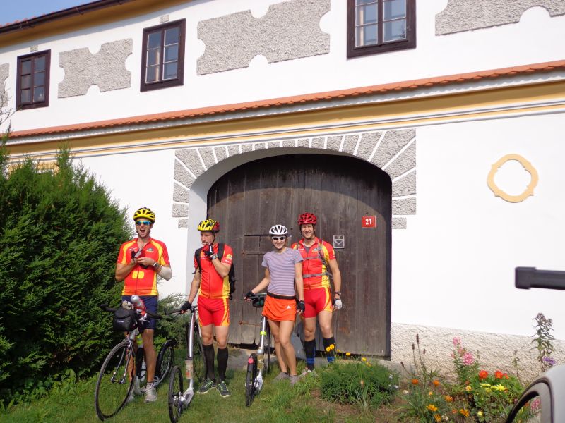Cíl vstát co nejdříve a vydat se na horskou etapu. Původně plánovaný start na 7.00 vychází až na 8.10. Z našeho „base campu“ nastupujeme na jižní cestu na Nové Hrady – Horní Stropnici – Dobrou a Hojnou Vodu. Následují divoké Novohradské hory, cesty skvělého asfaltu se střídají s rozbitými lesními cyklostezkami. Přes zapomenuté zakoutí tohoto cípu republiky se dostáváme přes Leopoldov a Tichou do Dolního Dvořiště. Vynikající oběd na náměstí. Opět těžké žaludky. Tentokrát však následuje pouze 1,5km dlouhé stoupáníčko k Rybníku a několikakilometrový sjezd do Herbertova. Po něm se roztáčí pověstný ultimátní červenožlutý vláček a točí se přes Vyšší Brod a Loučovice až na hráz lipenské přehrady. Návštěva koloběžkové půjčovny Lipnocetrum přímo v místní Marině. Cyklostezka Lipno-Frymburk. Lehké občerstvení. Následujícího úseku z Frymburka přes Světlík do Českého Krumlova se obáváme kvůli stoupání a rozbité nekvalitní silnici – přes prázdniny se však stal zázrak! Po celé délce tohoto úseku je nádherný nově položený asfaltový koberec a jízda po něm je fantastická. Stoupání bolí, ale následují kilometry překrásných bezpečných sjezdů! Krumlov – silnice směr Kaplice, odbočka na Velešín a výšlap do Svatého Jana nad Malší. Dále Trhové Sviny – Olešnice – Jílovice a cíl. Celkem 168km s nastoupanými 2141m.